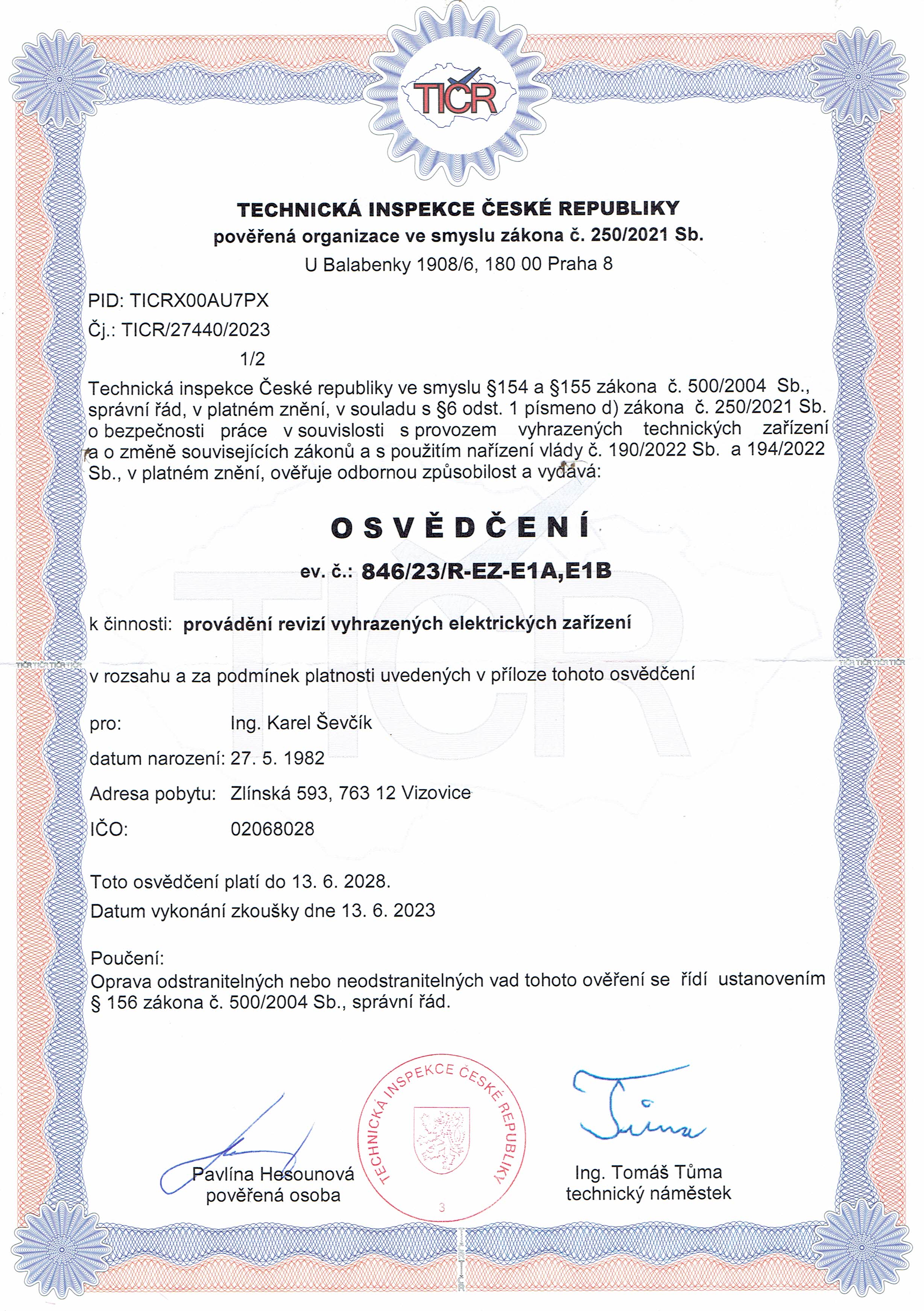 Osvědčení k činnosti od TIČR